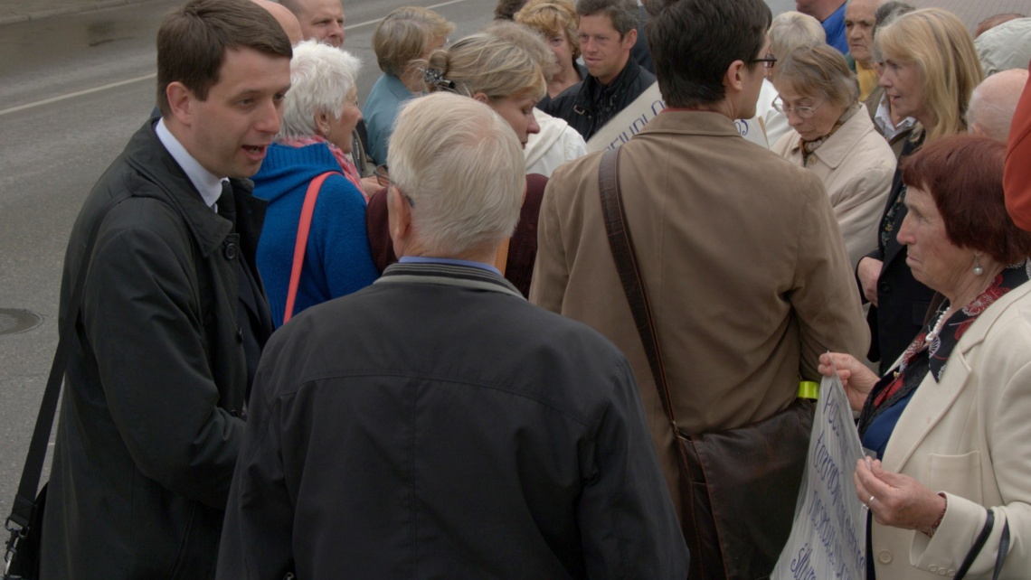 Po vieno iš piketų, prieš prasidedant Šiaulių miesto savivaldybės tarybos posėdžiui, su miestiečiais bendrauja Tarybos narys Aurimas Nausėda (pirmas iš kairės) ir Lietuvos nacionalinės vartotojų federacijos Šiaulių skyriaus koordinatorius dr. Eduardas Svirskis (stovi šalia Aurimo Nausėdos)